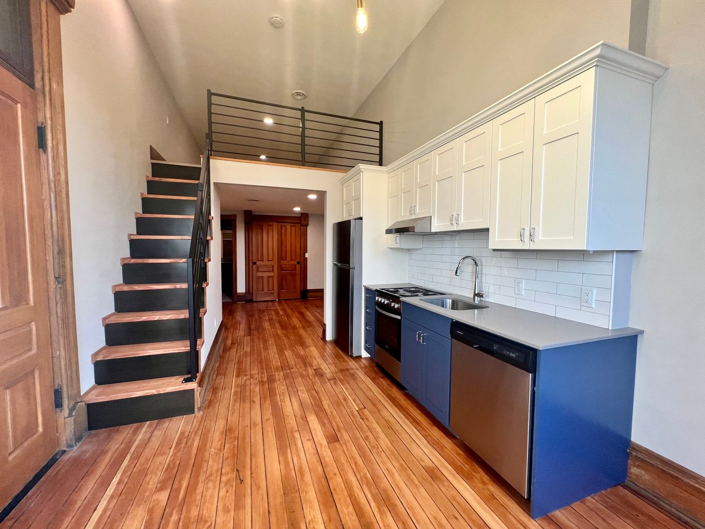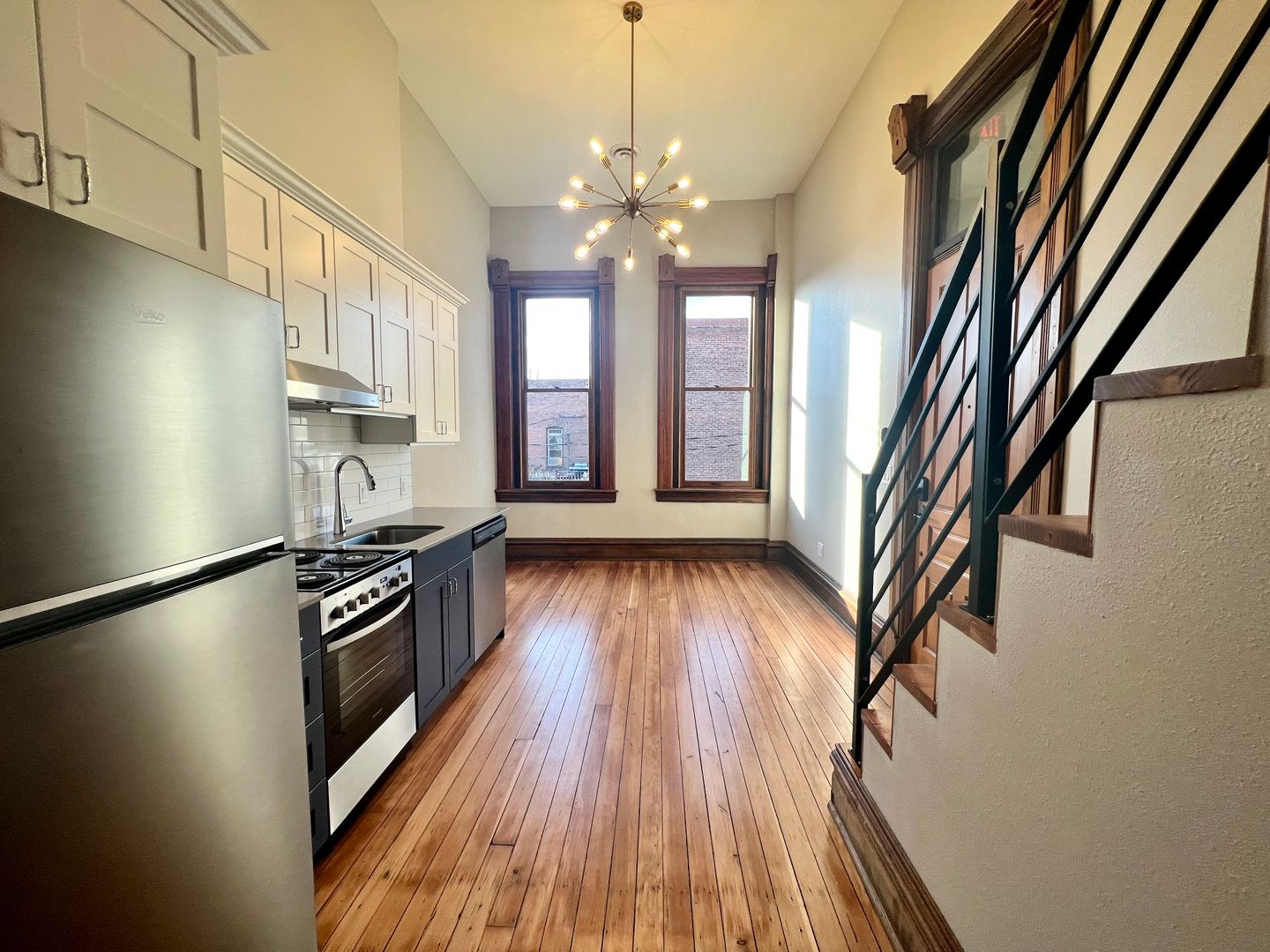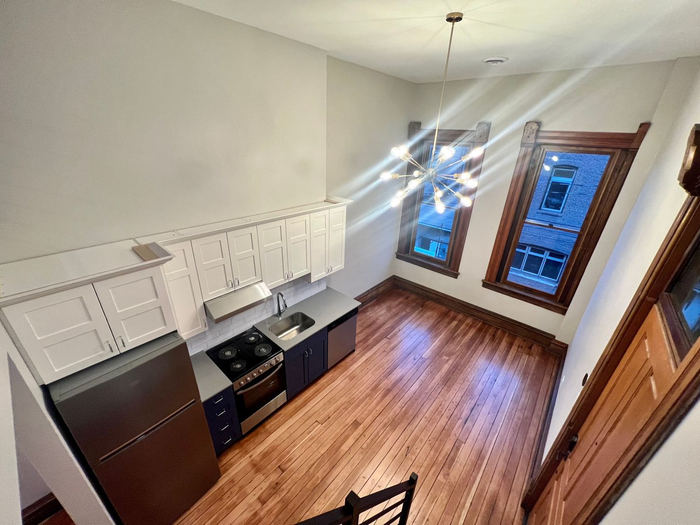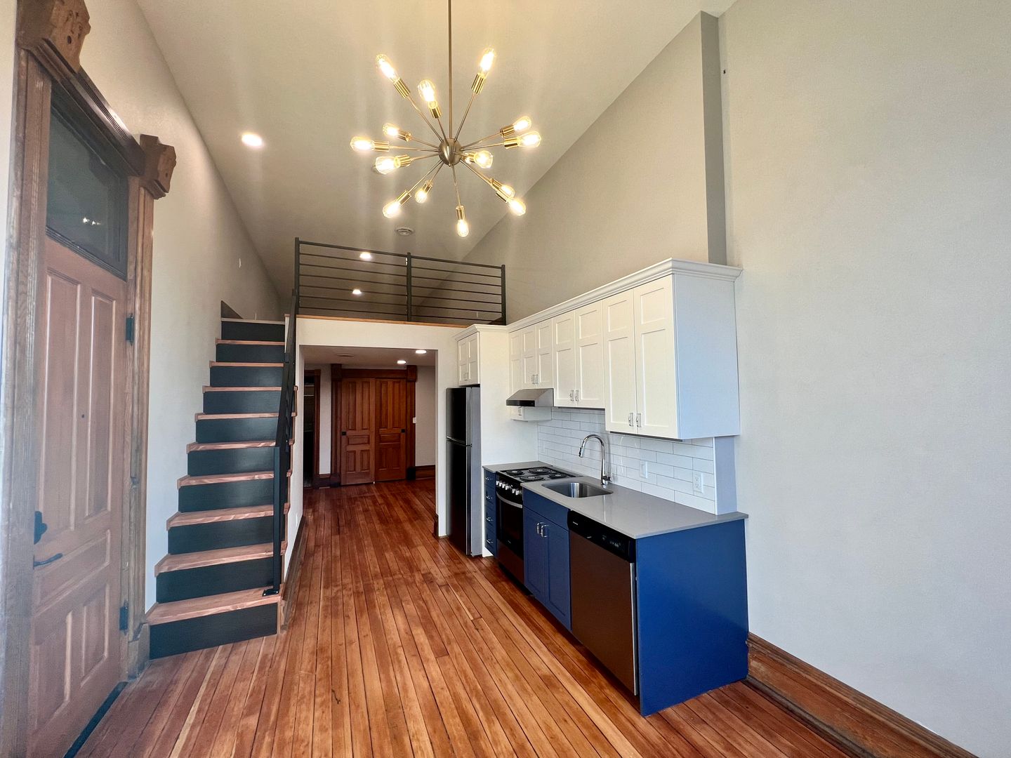 This Studio Loft has tasteful cabinetry in the kitchen and an open concept space with large windows and a statement piece, dimmable chandelier. Stairs just off of the kitchen lead you to the upstairs loft. With a closet that has built-in shelving and a bathroom with walk-in shower and modern tile work, this studio has the "wow" factor.