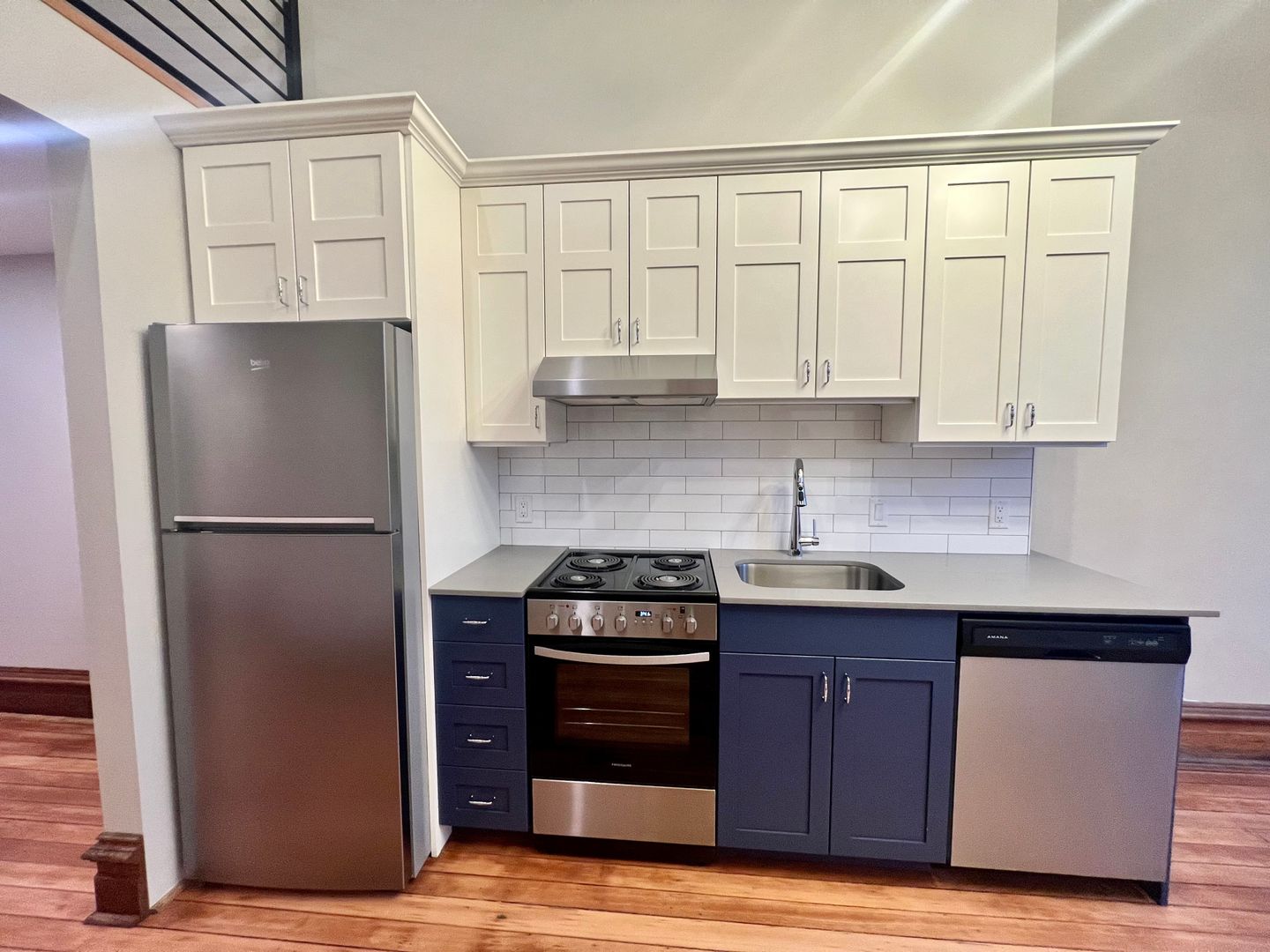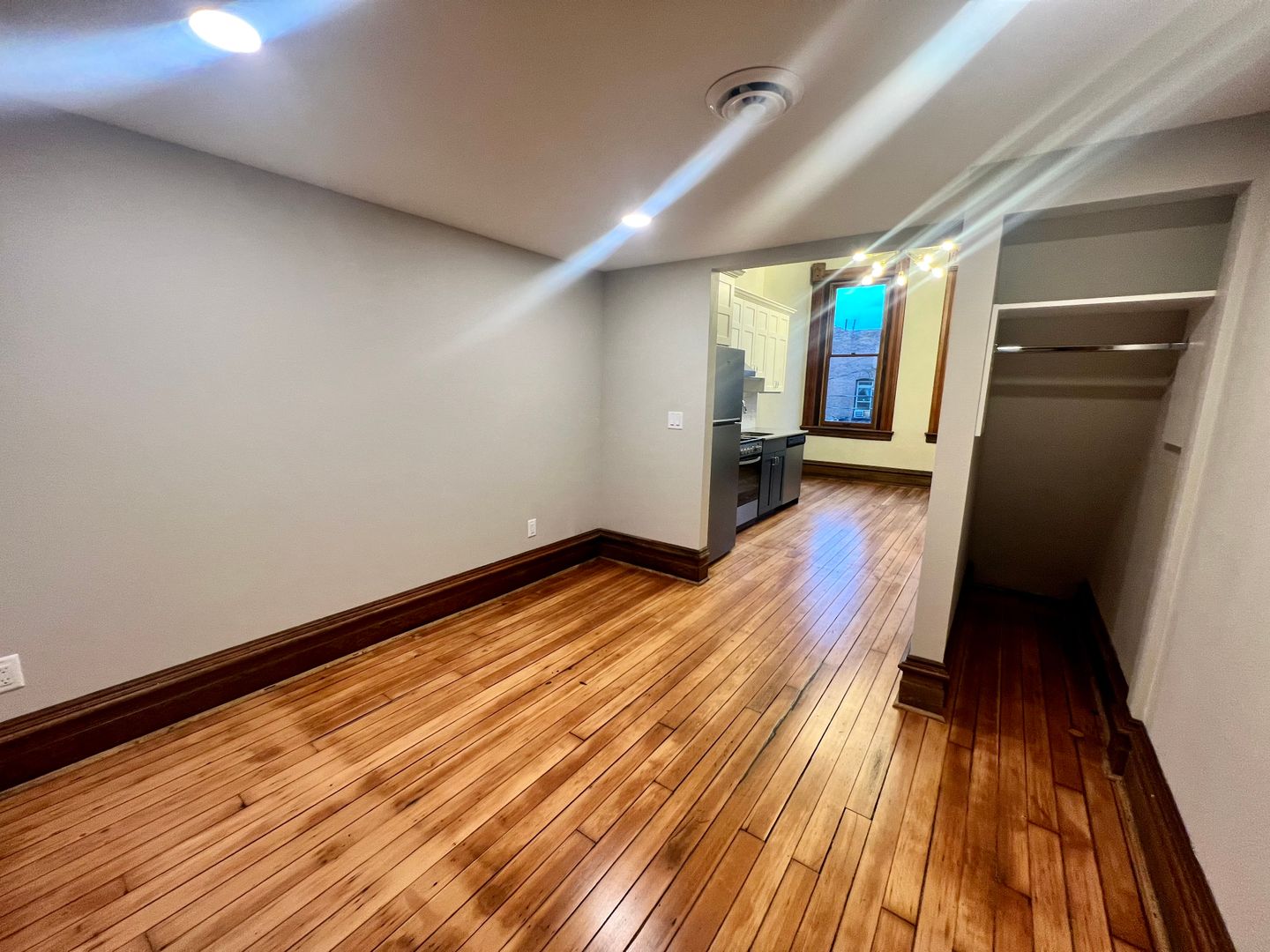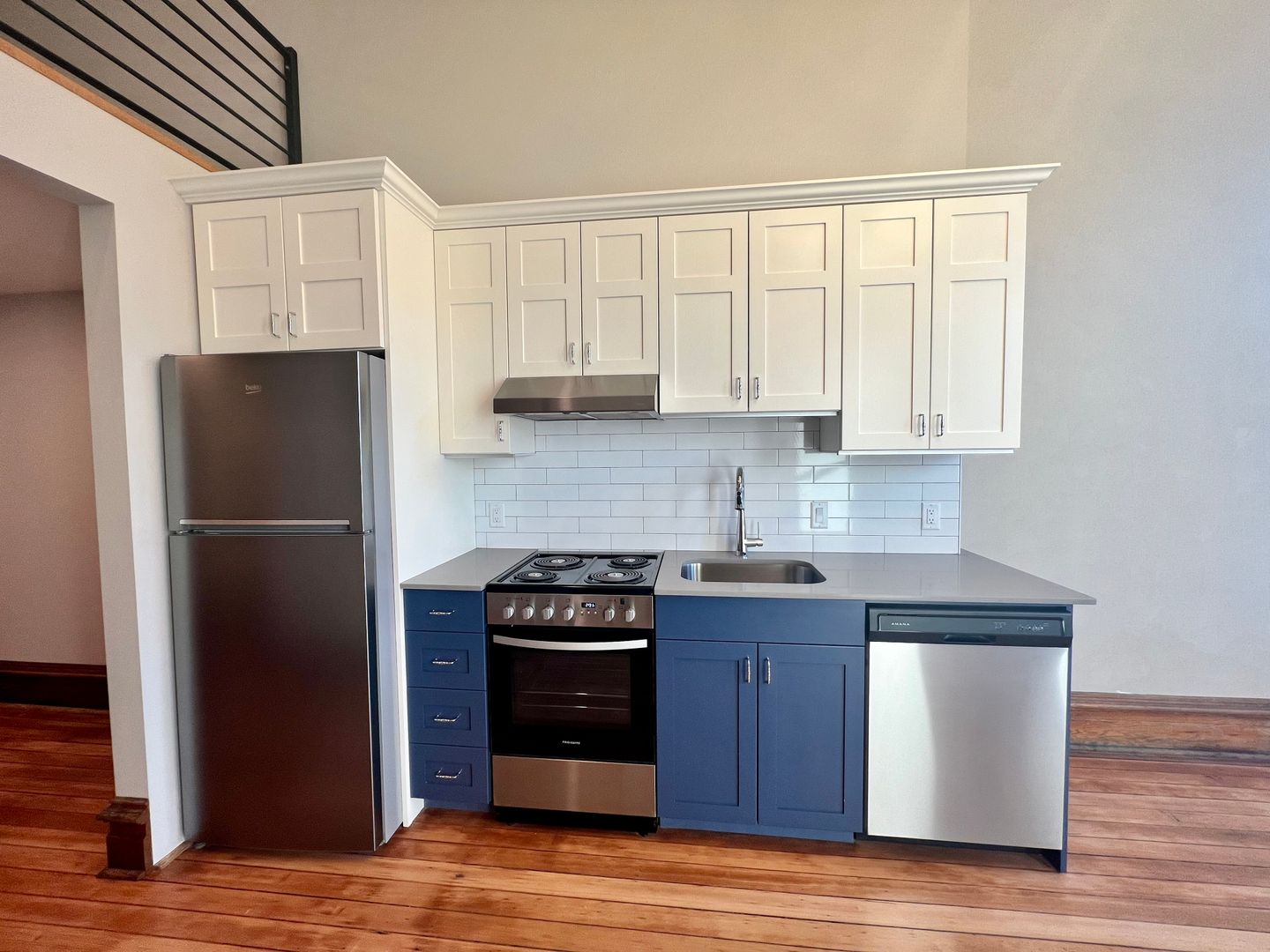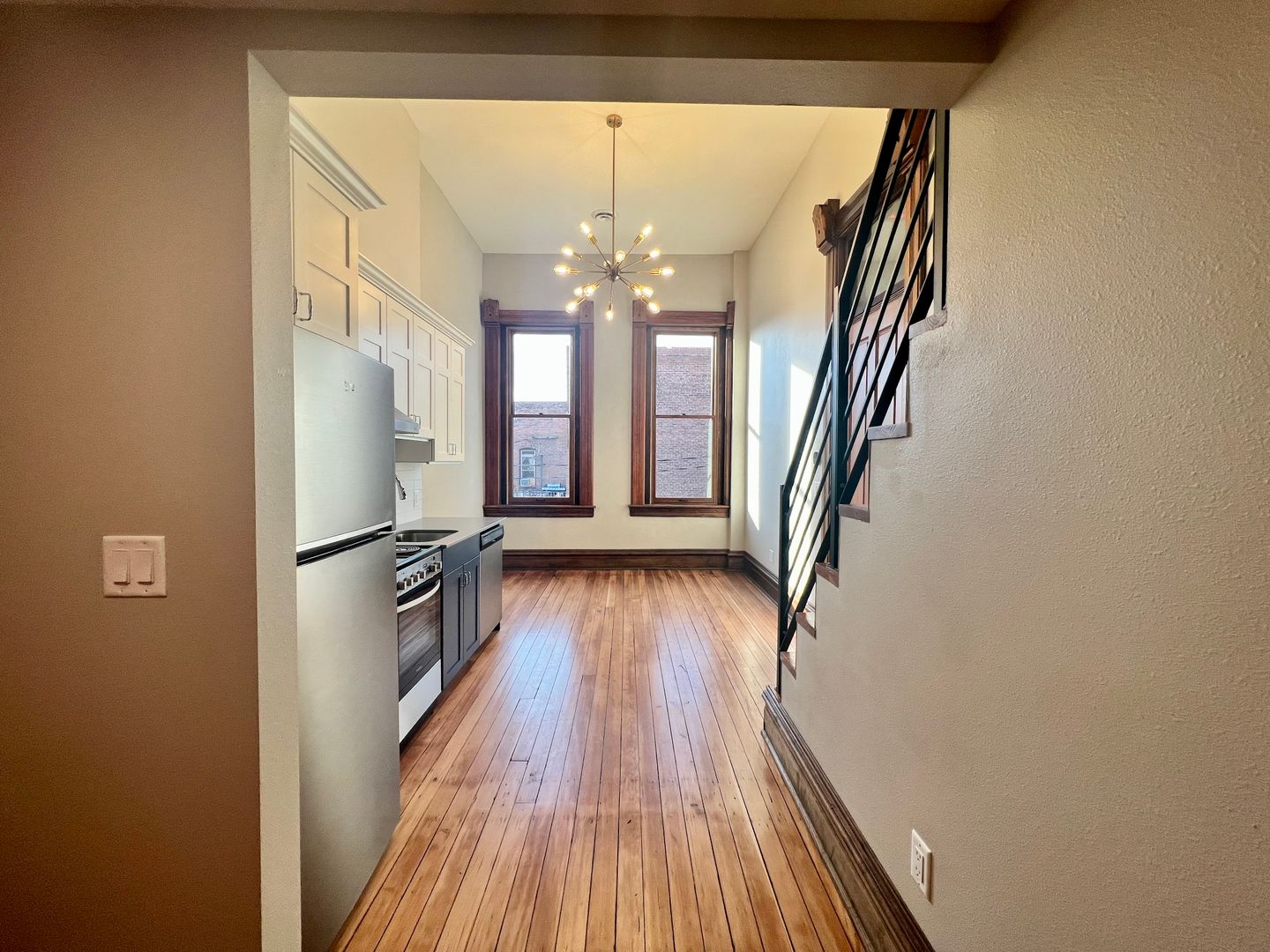 This Studio Loft has tasteful cabinetry in the kitchen and an open concept space with large windows and a statement piece, dimmable chandelier. Stairs just off of the kitchen lead you to the upstairs loft. With a closet that has built-in shelving and a bathroom with walk-in shower and modern tile work, this studio has the "wow" factor.