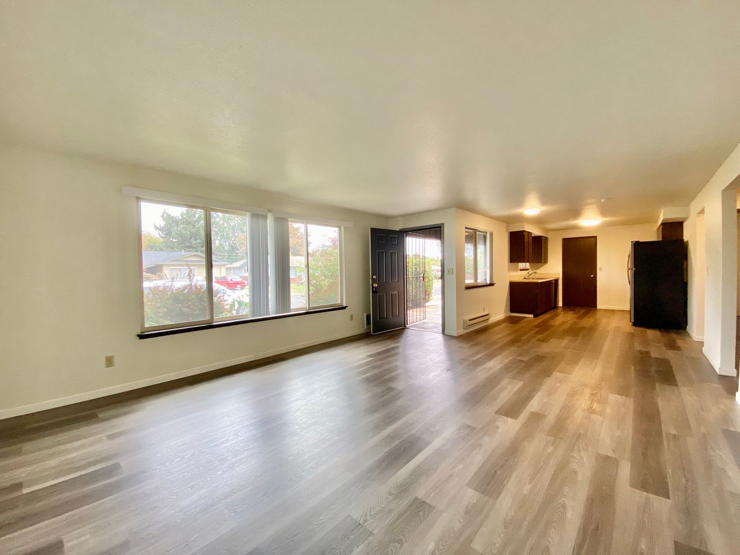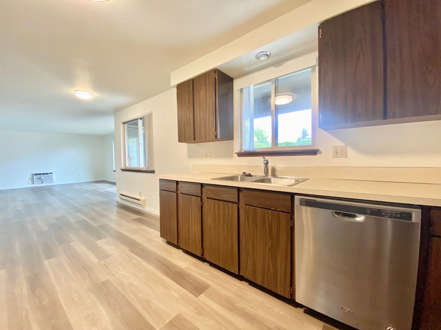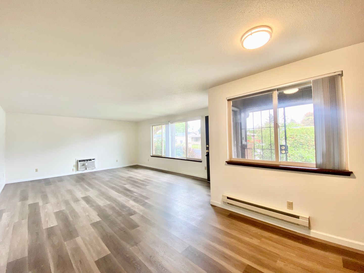 Step through the front door into a spacious living room filled with natural light streaming through a large, picturesque window. The open floor plan makes the home feel bright and inviting, while the kitchen provides generous counter space, perfect for cooking and entertaining. Both bedrooms are well-sized, each featuring large windows and ample closet space to make storage simple.