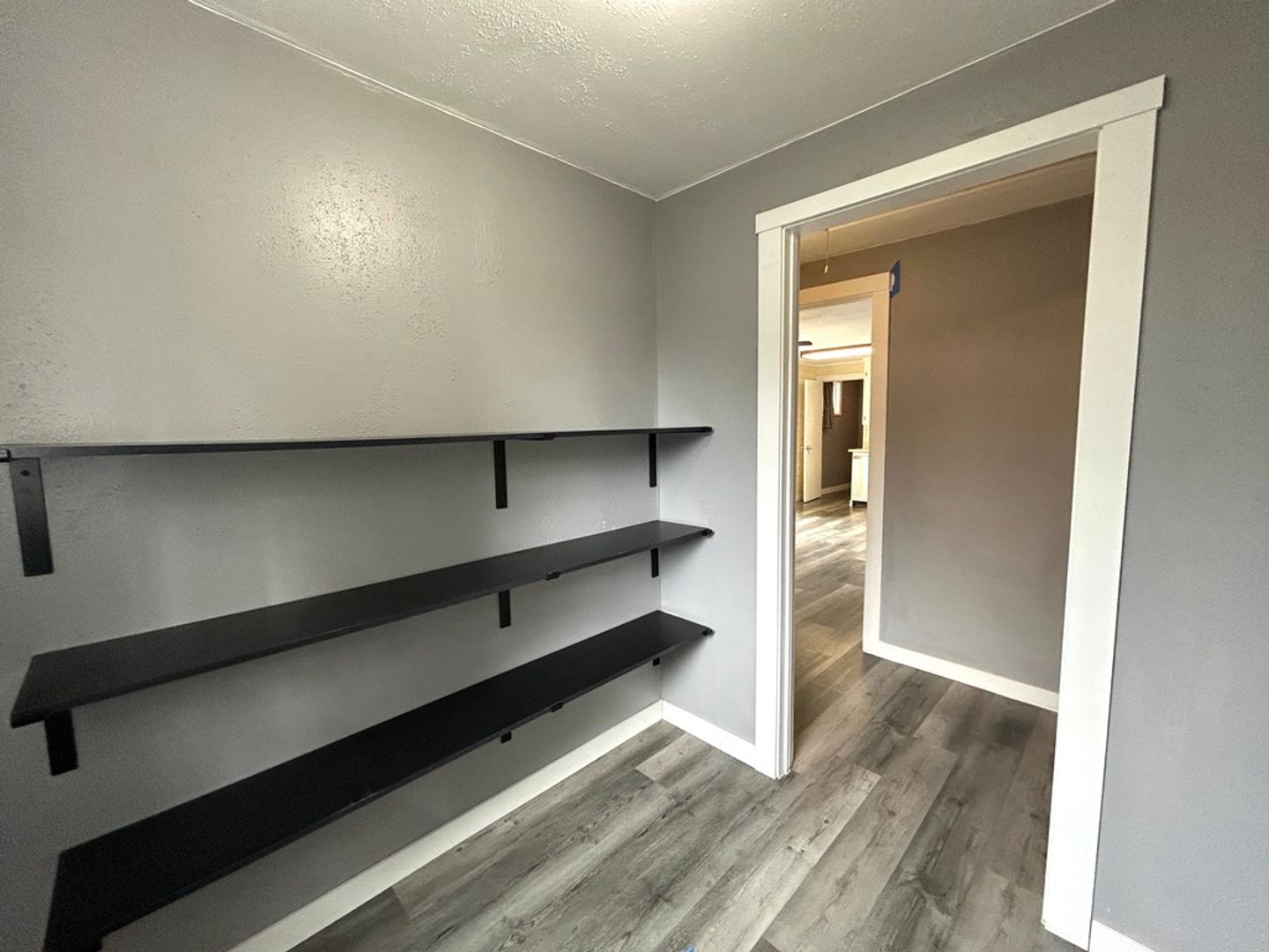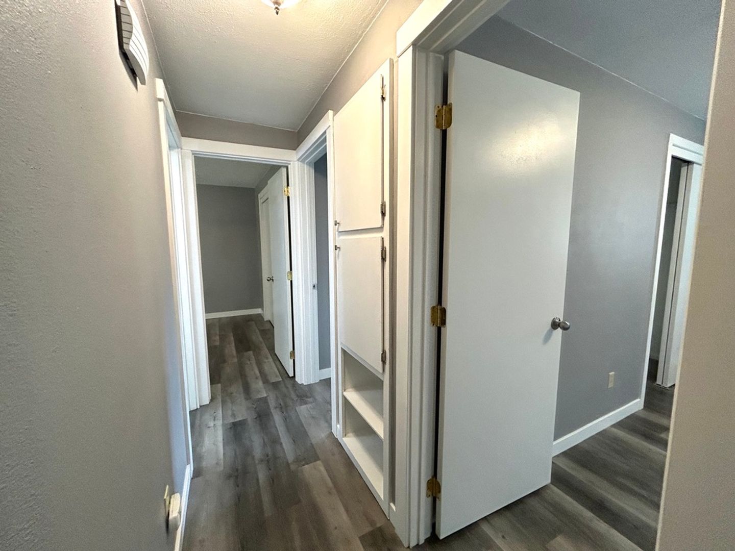 The north side of the home boasts three bedrooms and one and a half bathrooms. Built in storage and accent walls add character to the home.