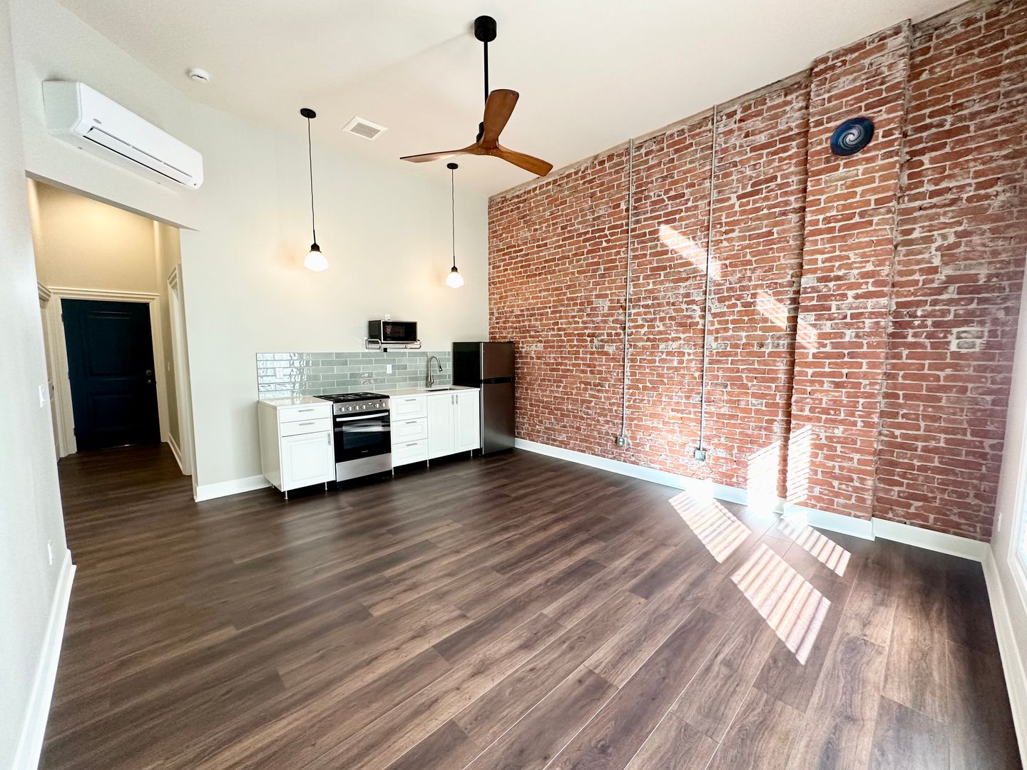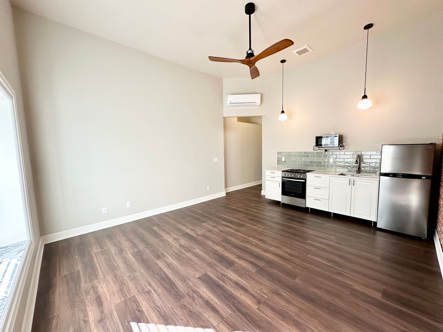 Introducing a modern studio apartment located in the heart of downtown Ellensburg. This sleek and stylish apartment features hardwood floors and stainless steel appliances, creating a contemporary living space. Large windows create a light-filled residence while the original brick nods to the timeless character of the town. The bathroom features sleek cabinetry, modern tile, and a walk in shower.