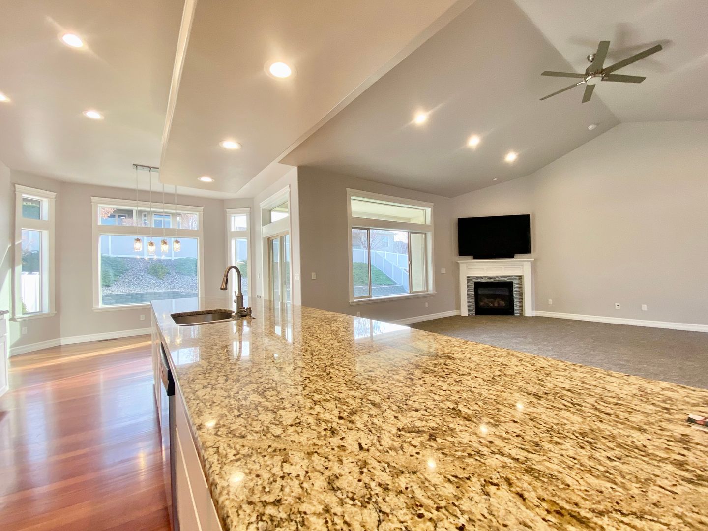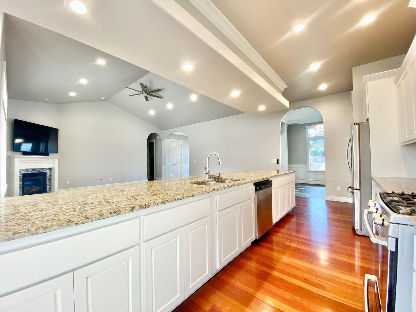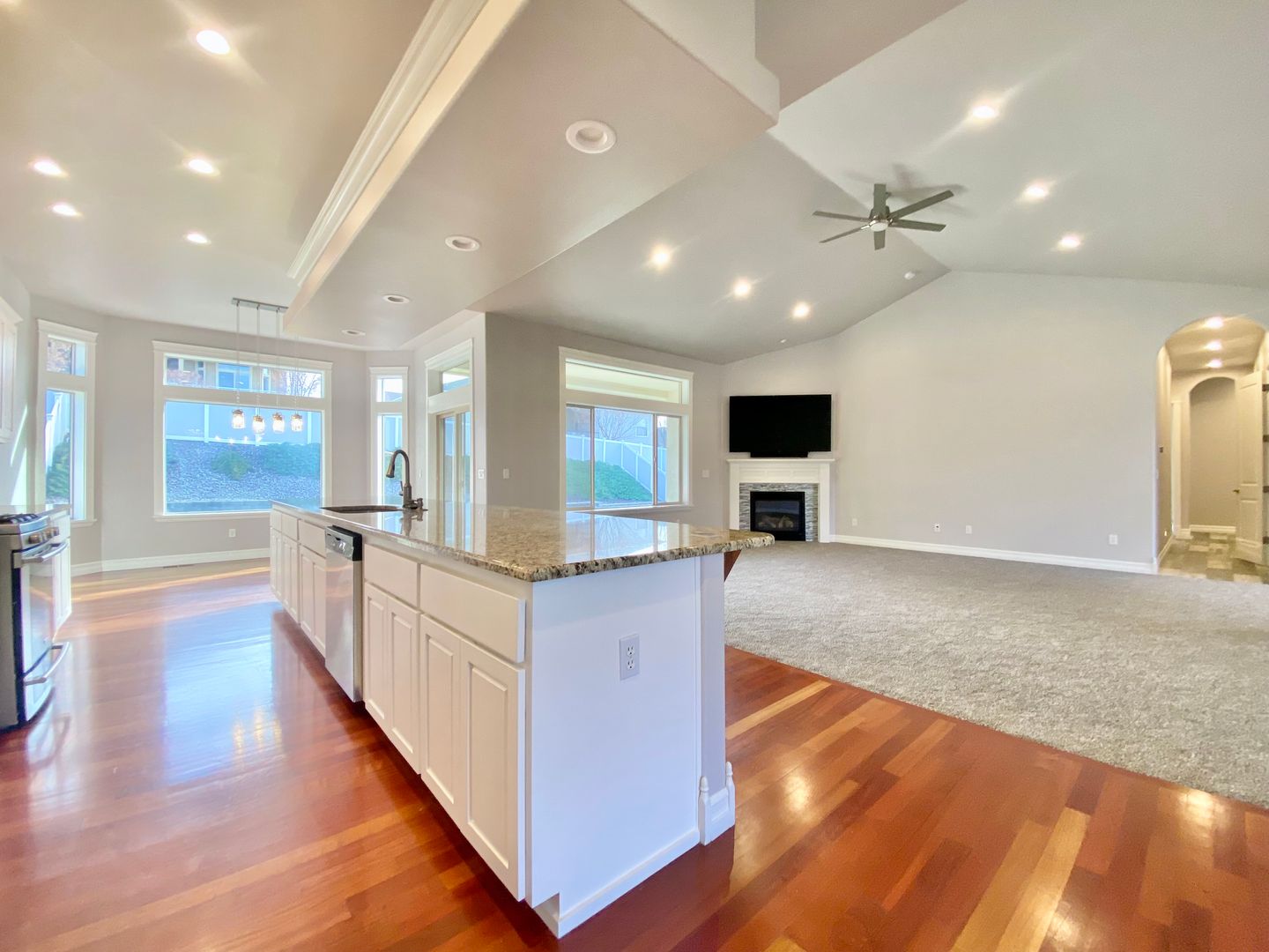 The open-concept kitchen is designed for everyday living and hosting alike, featuring granite countertops, a spacious center island, pantry, and gas range. It flows seamlessly into a sunny dining nook and the inviting great room with vaulted ceilings and a cozy gas fireplace, creating a warm central hub for gathering.
