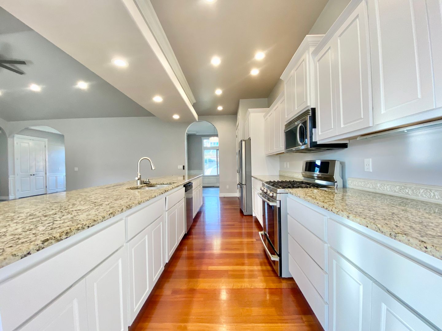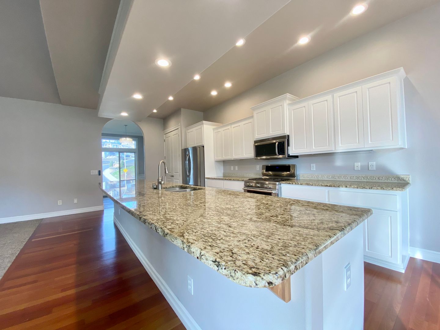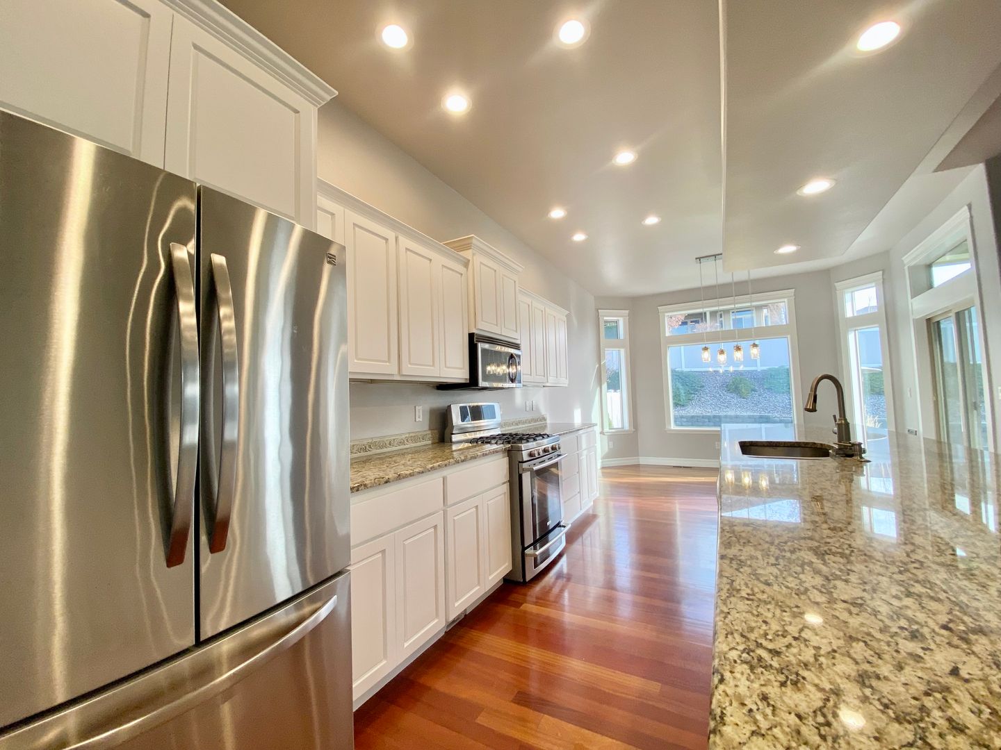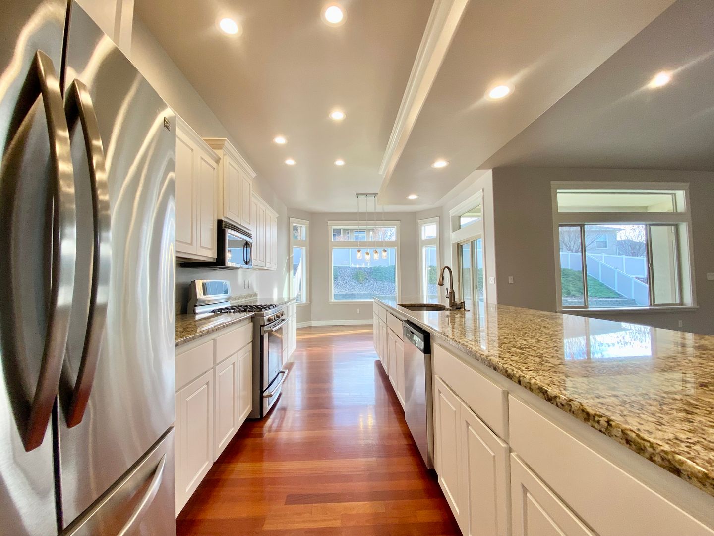 The open-concept kitchen is designed for everyday living and hosting alike, featuring granite countertops, a spacious center island, pantry, and gas range. It flows seamlessly into a sunny dining nook and the inviting great room with vaulted ceilings and a cozy gas fireplace, creating a warm central hub for gathering.