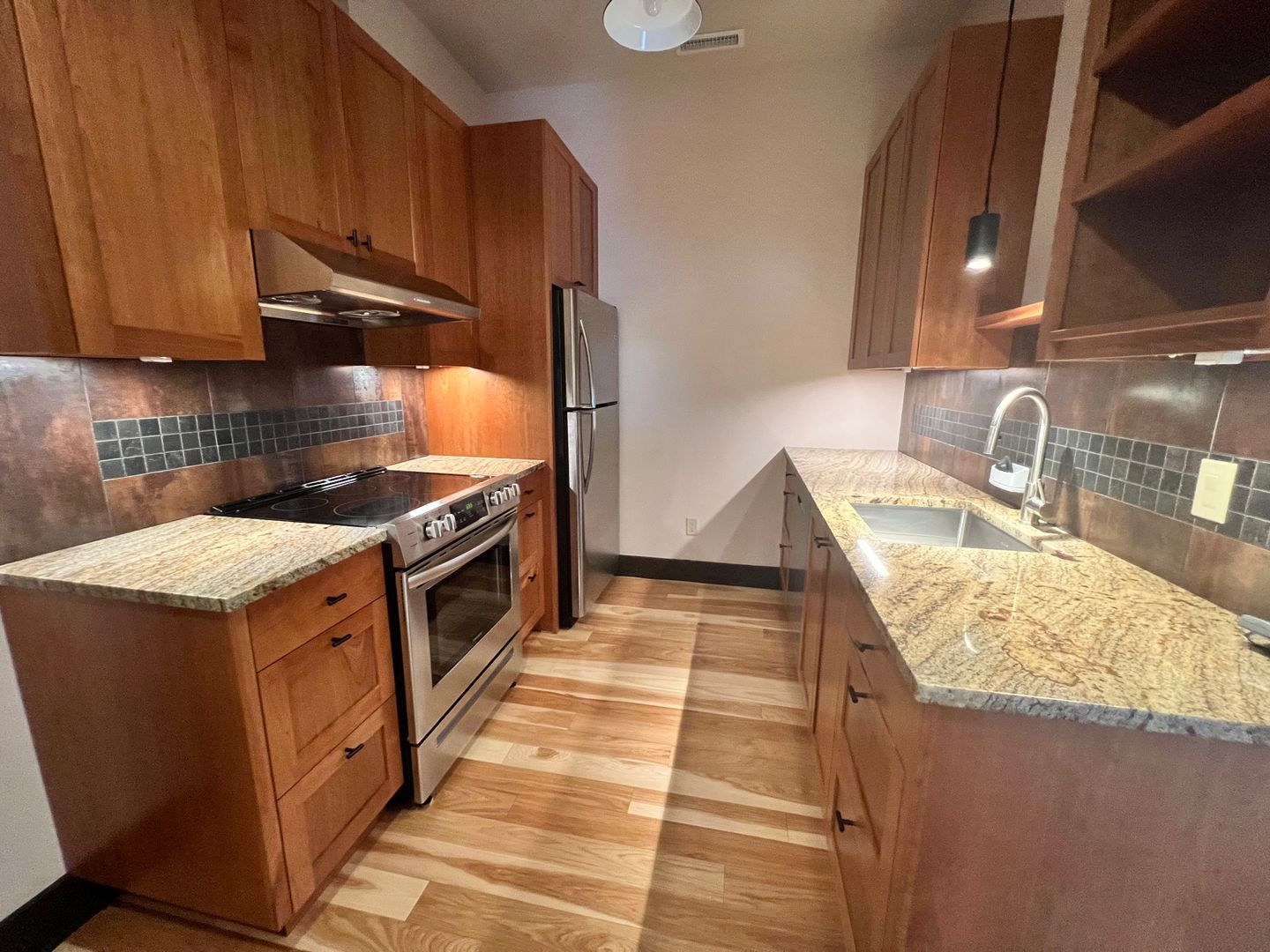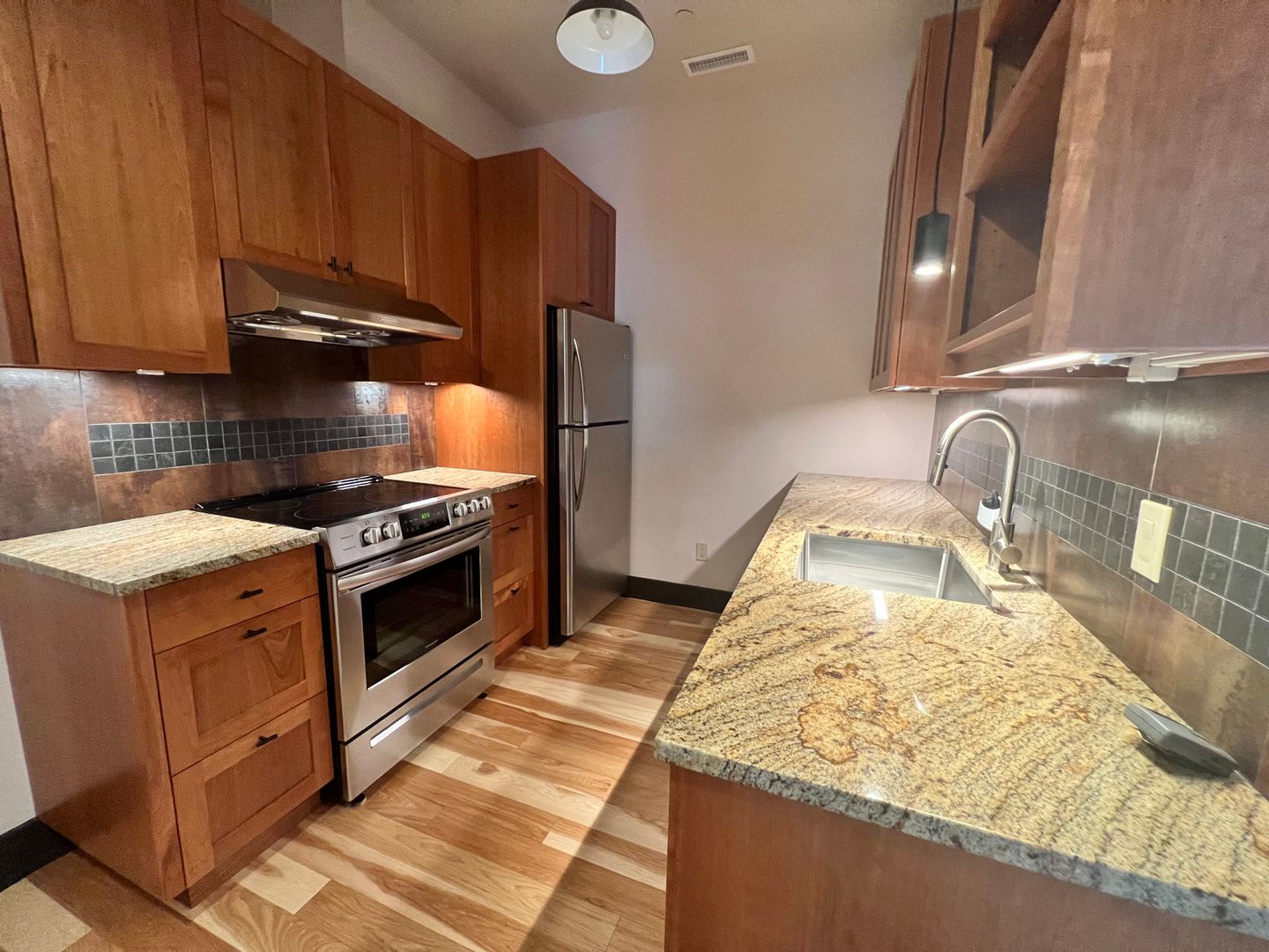 Welcome to this luxurious, Northwest-inspired apartment in the heart of downtown. Thoughtfully designed with high-end finishes, it features warm hardwood floors, granite countertops, and stainless steel appliances. Large windows and skylights fill the space with natural light and offer stunning mountain views.