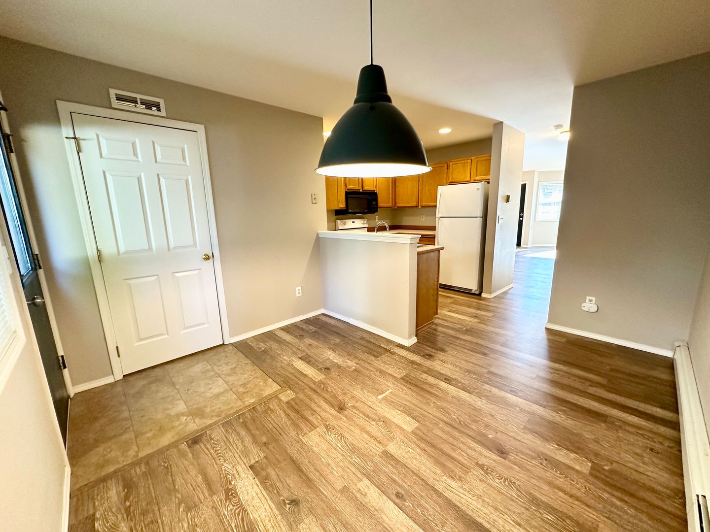 Step inside this beautifully remodeled 2 bedroom, 1.5 bathroom townhouse and be captivated by the inviting ambiance that greets you. The main level showcases LVP flooring, adding an elegant touch to the living spaces while ensuring durability and easy maintenance. The open-concept layout seamlessly connects the living room, dining area, and kitchen, providing a versatile space for relaxation and entertainment.