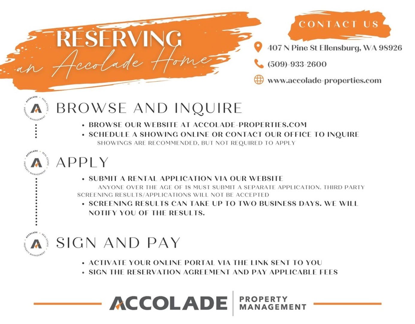 HOW TO APPLY: Once you have toured the property and are ready to apply, visit our website www.Accolade-Rentals.com to apply online. Applications are $50 per adult over the age of 18. Each person must fill out a separate application; there are no joint applications for married persons or co-signers.