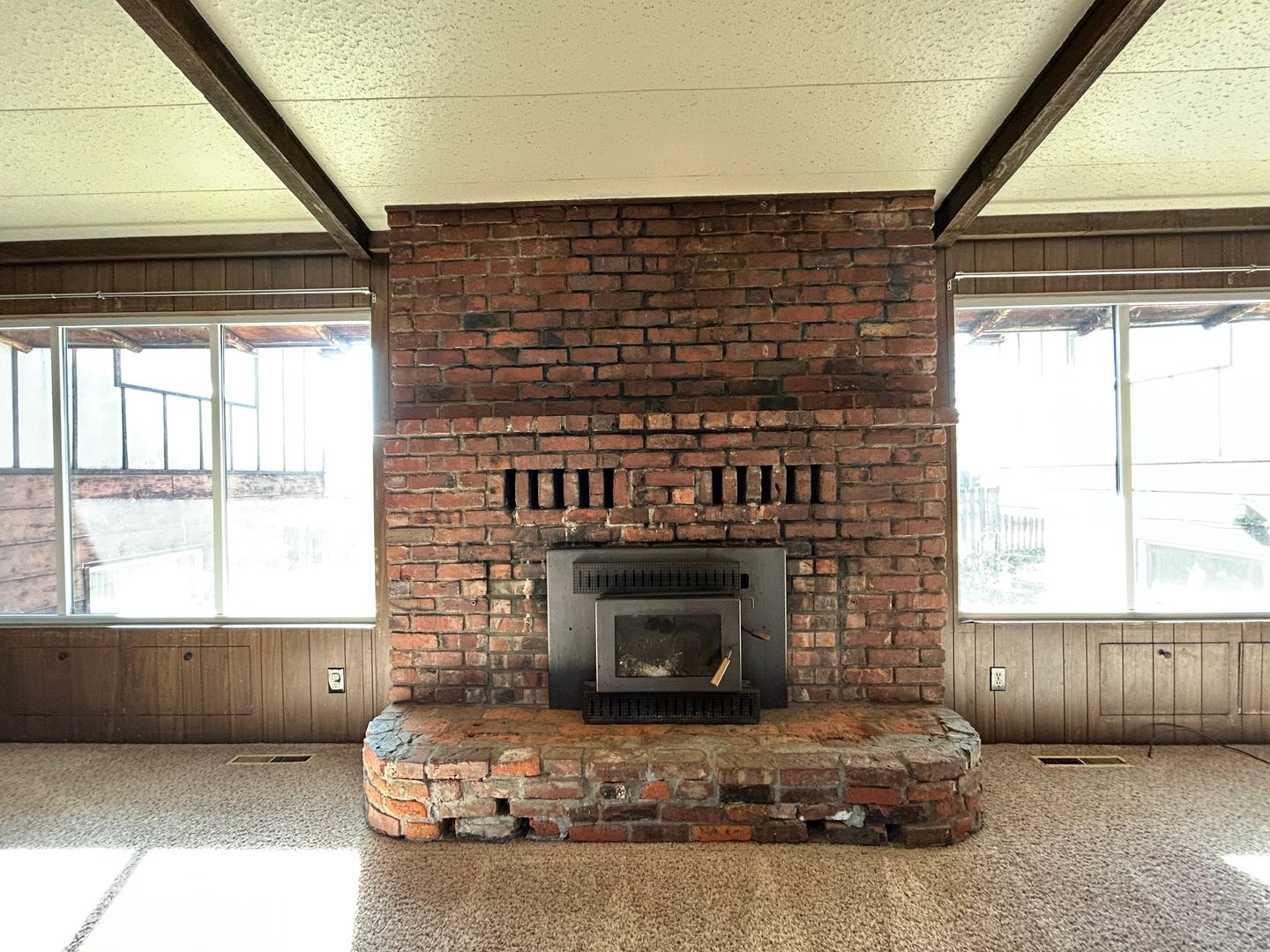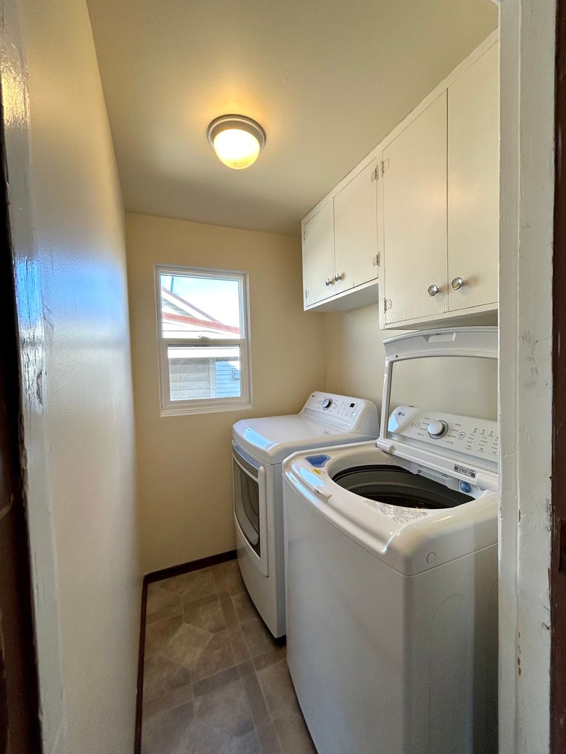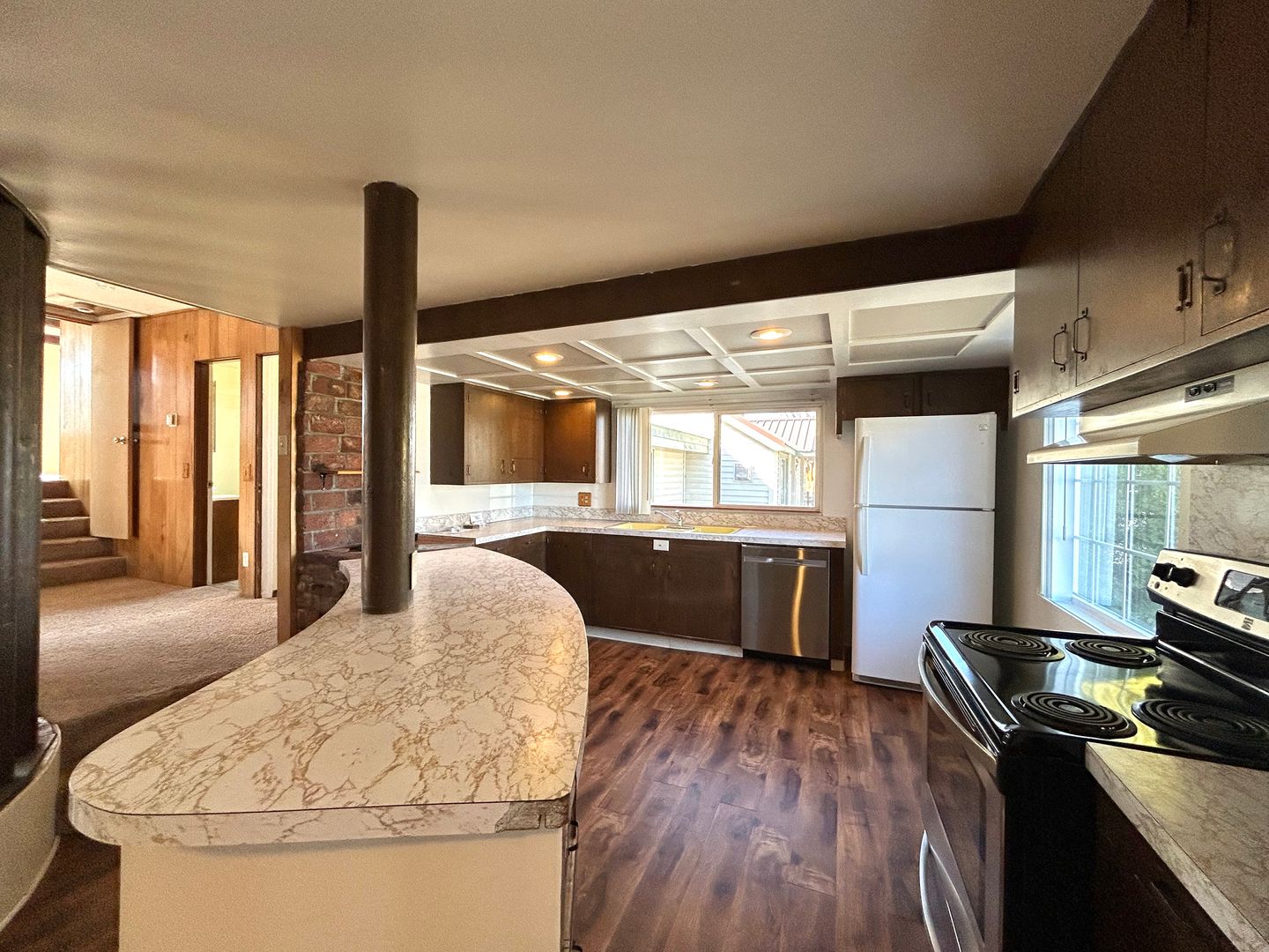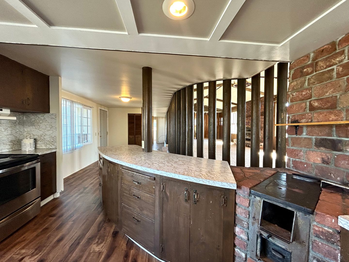 This unique 5 bedroom, 2 bathroom home is centrally located on a nicely appointed lot with a fenced yard. This home combines modern convenience with unique charm. The spacious living room features high ceilings and a decorative wood stove. The curved cabinetry in the kitchen flows seamlessly with the home, forming the ideal backdrop for gatherings. Washer and dryer included.