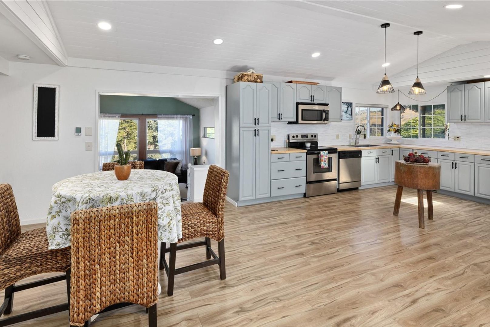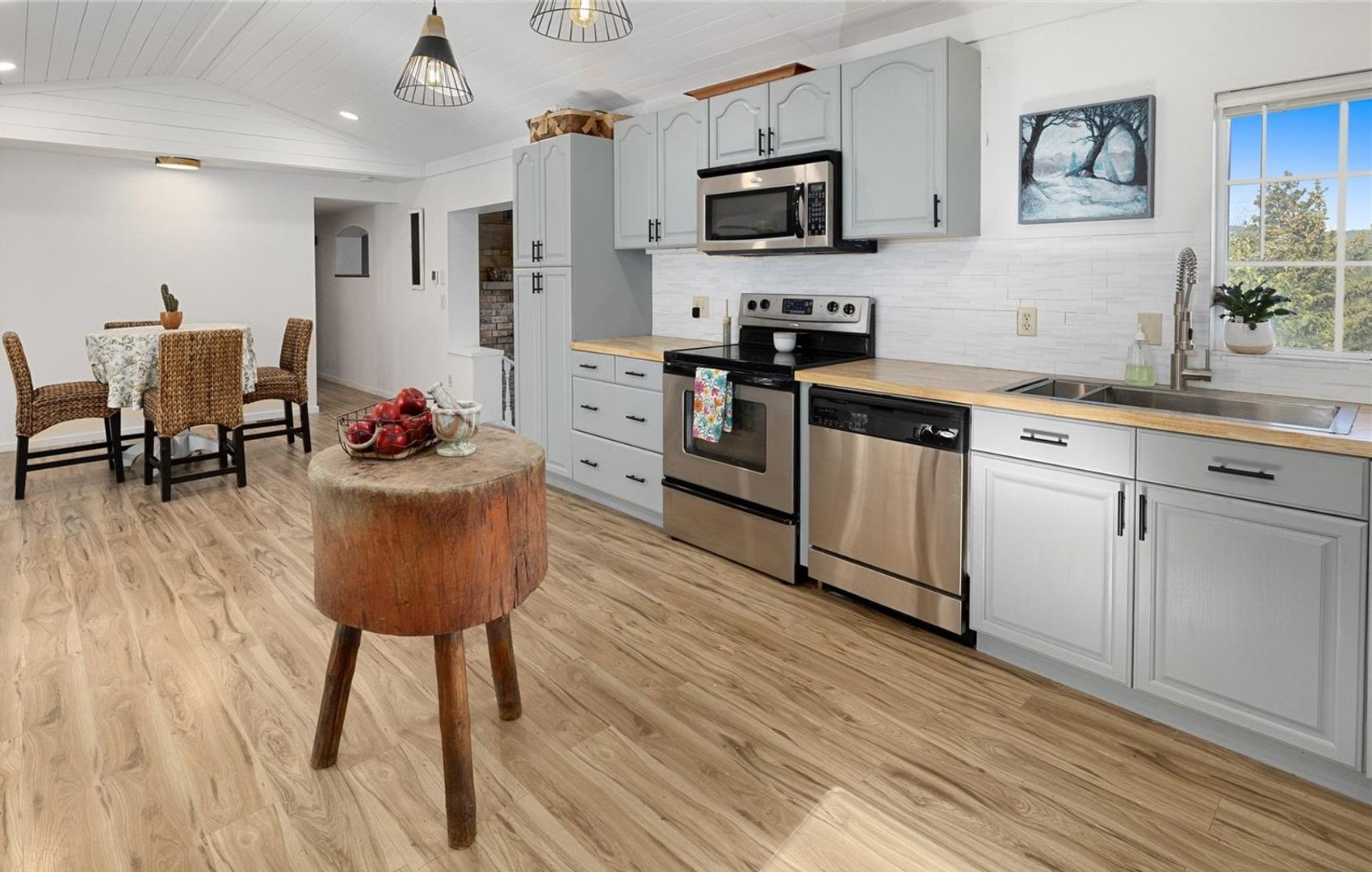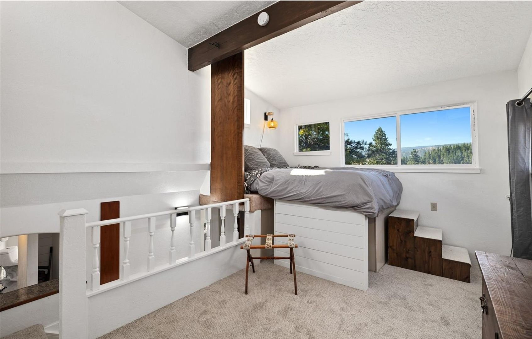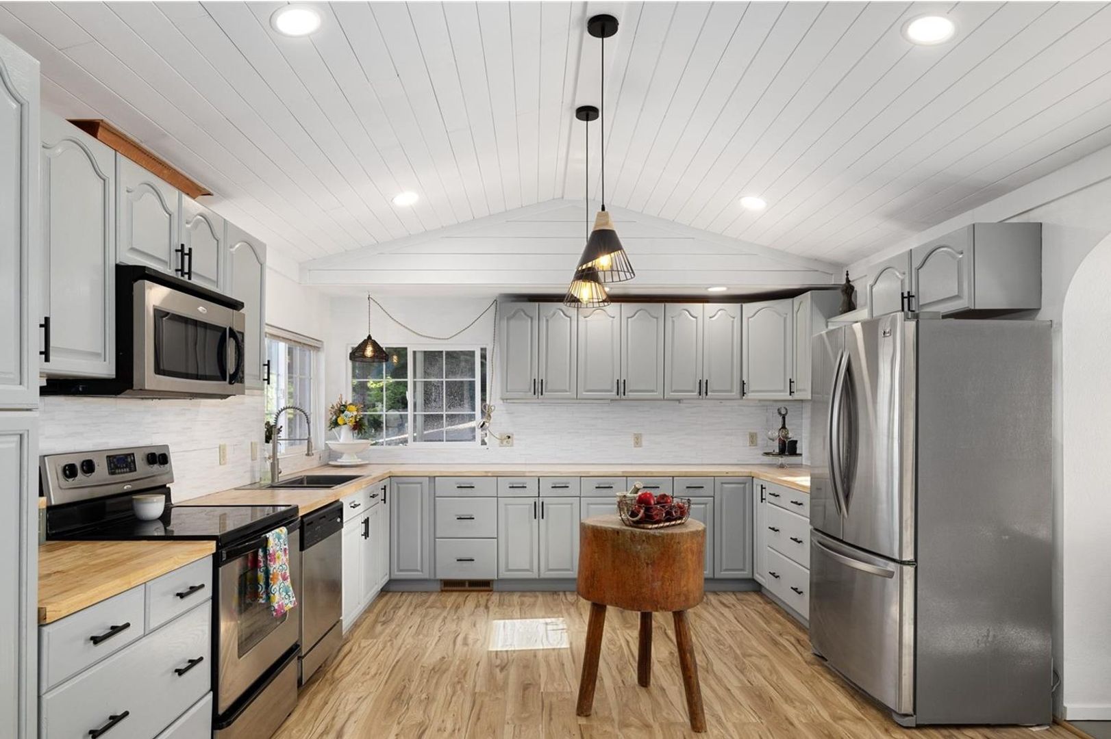 This 3-bedroom, 2-bath home in Sunlight Waters shines with a modern, chic vibe. Inside, the home blends modern style with warm, inviting spaces. The kitchen pours in natural light from oversized windows and features vaulted ceilings, fresh lighting, butcher-block counters, a comfortable lounging nook, and an open dining area. A charming loft bedroom adds personality, while the main living room’s fireplace creates the perfect retreat.