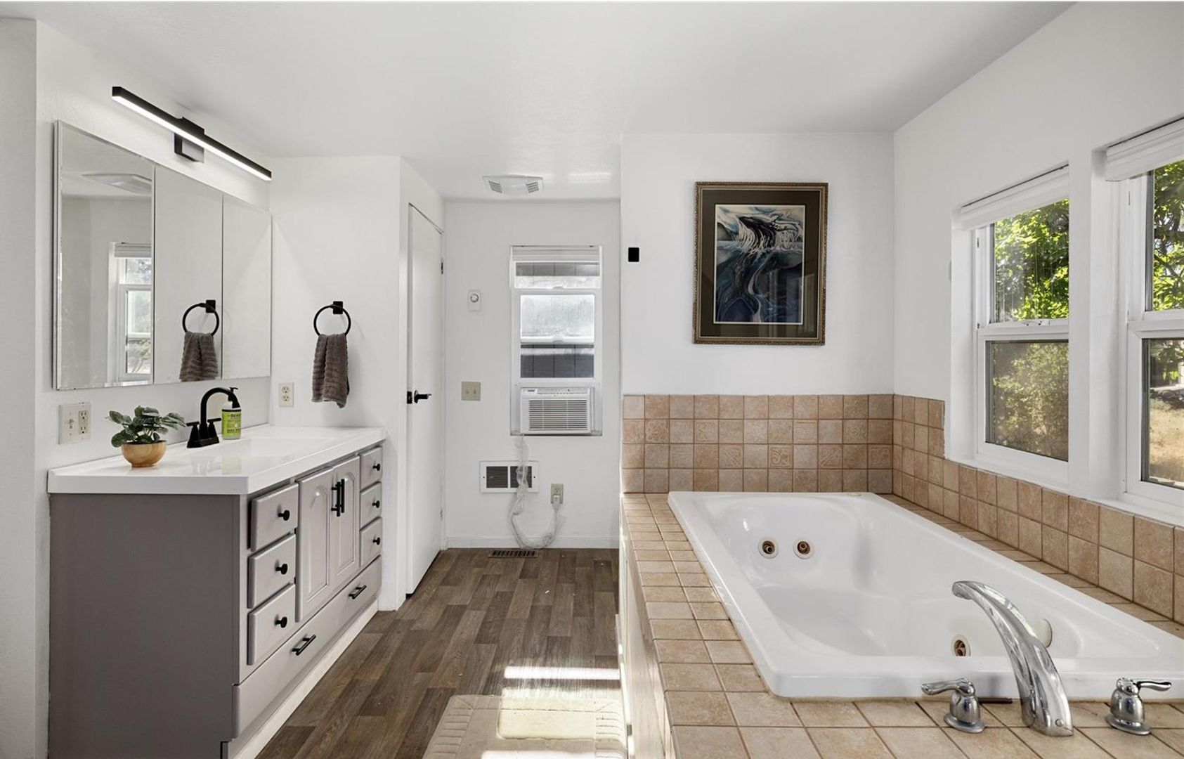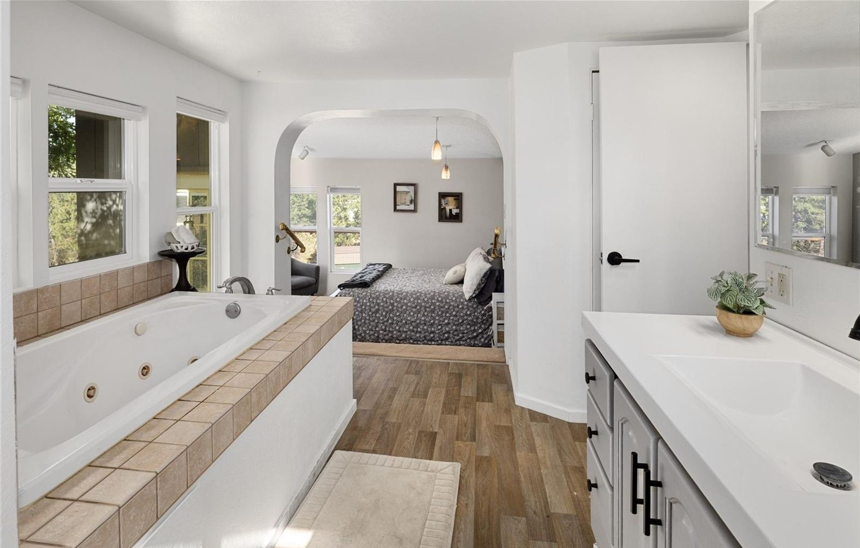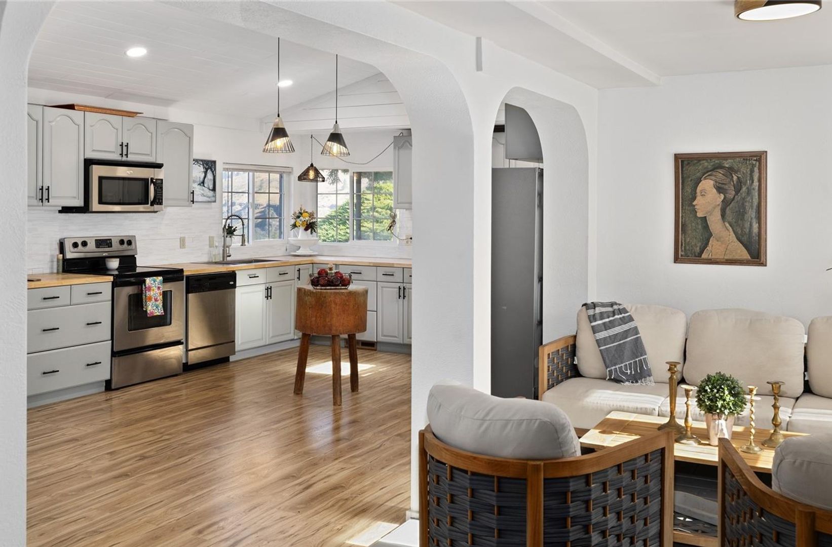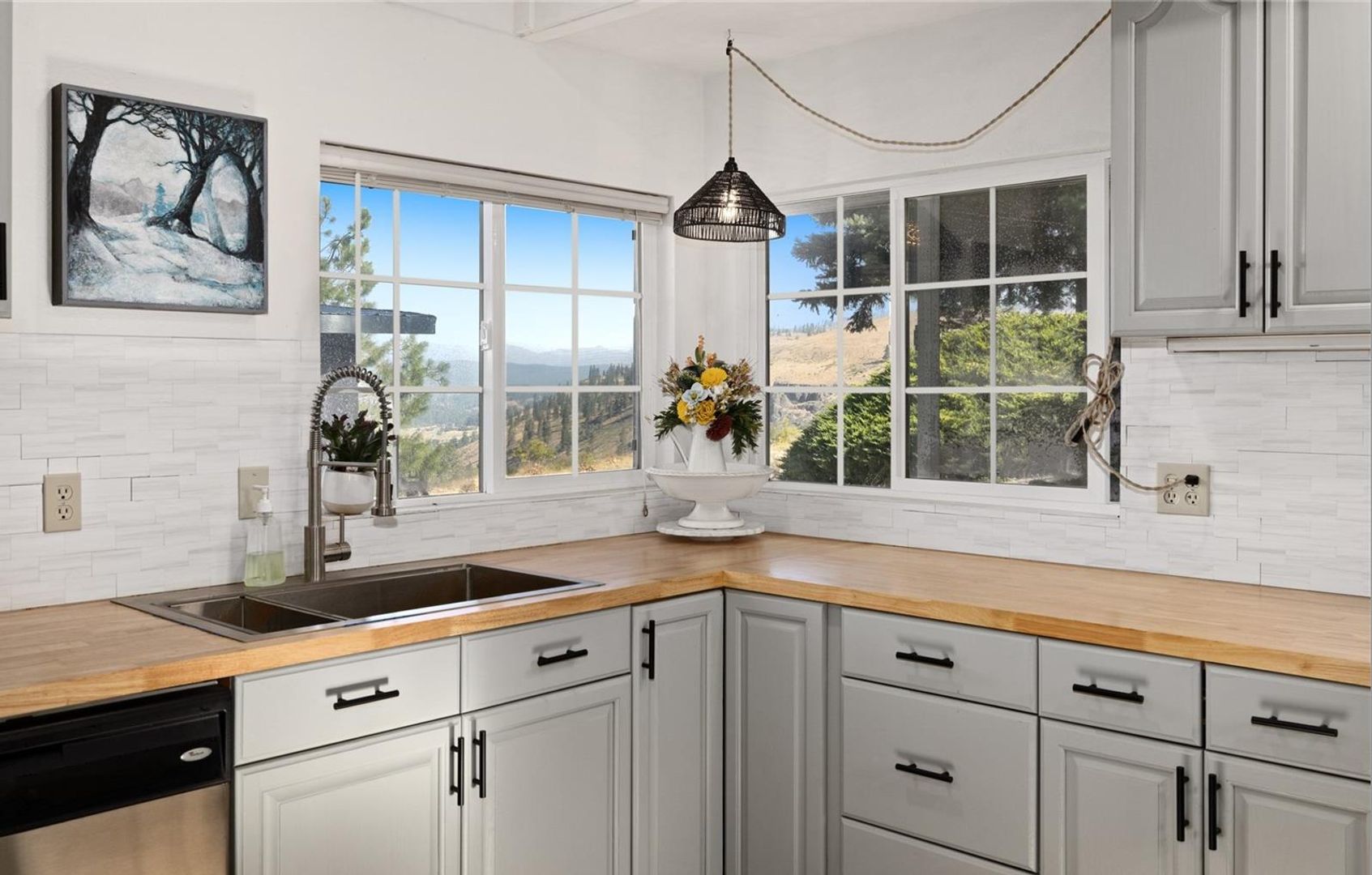 This 3-bedroom, 2-bath home in Sunlight Waters shines with a modern, chic vibe. Inside, the home blends modern style with warm, inviting spaces. The kitchen pours in natural light from oversized windows and features vaulted ceilings, fresh lighting, butcher-block counters, a comfortable lounging nook, and an open dining area. A charming loft bedroom adds personality, while the main living room’s fireplace creates the perfect retreat.