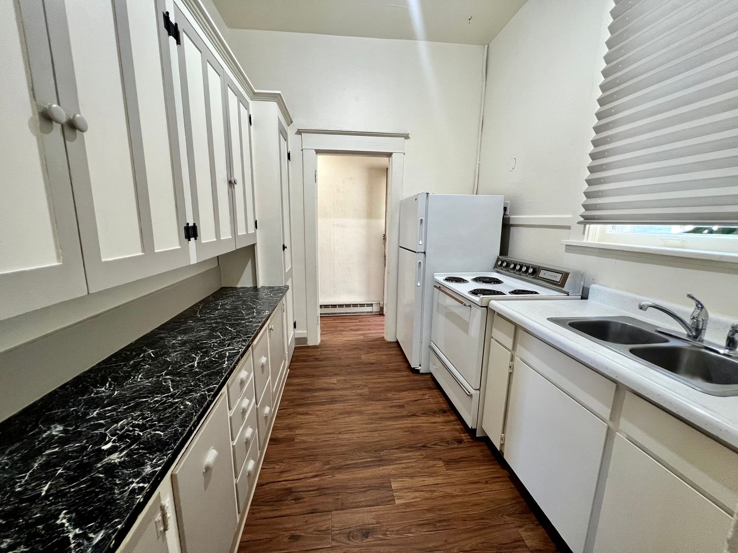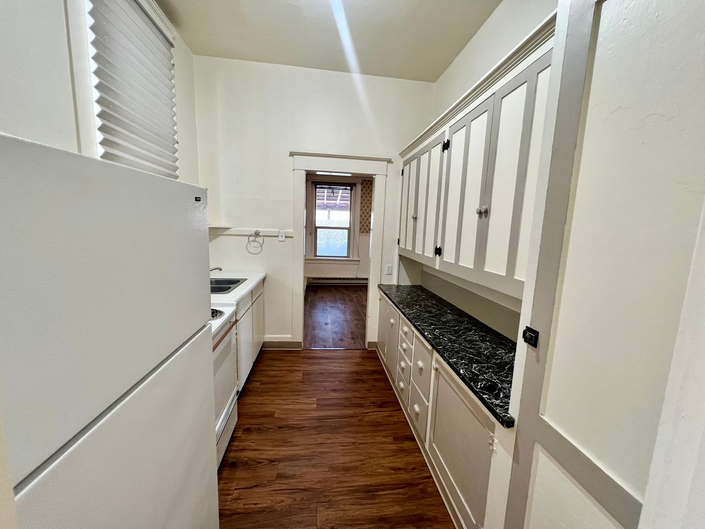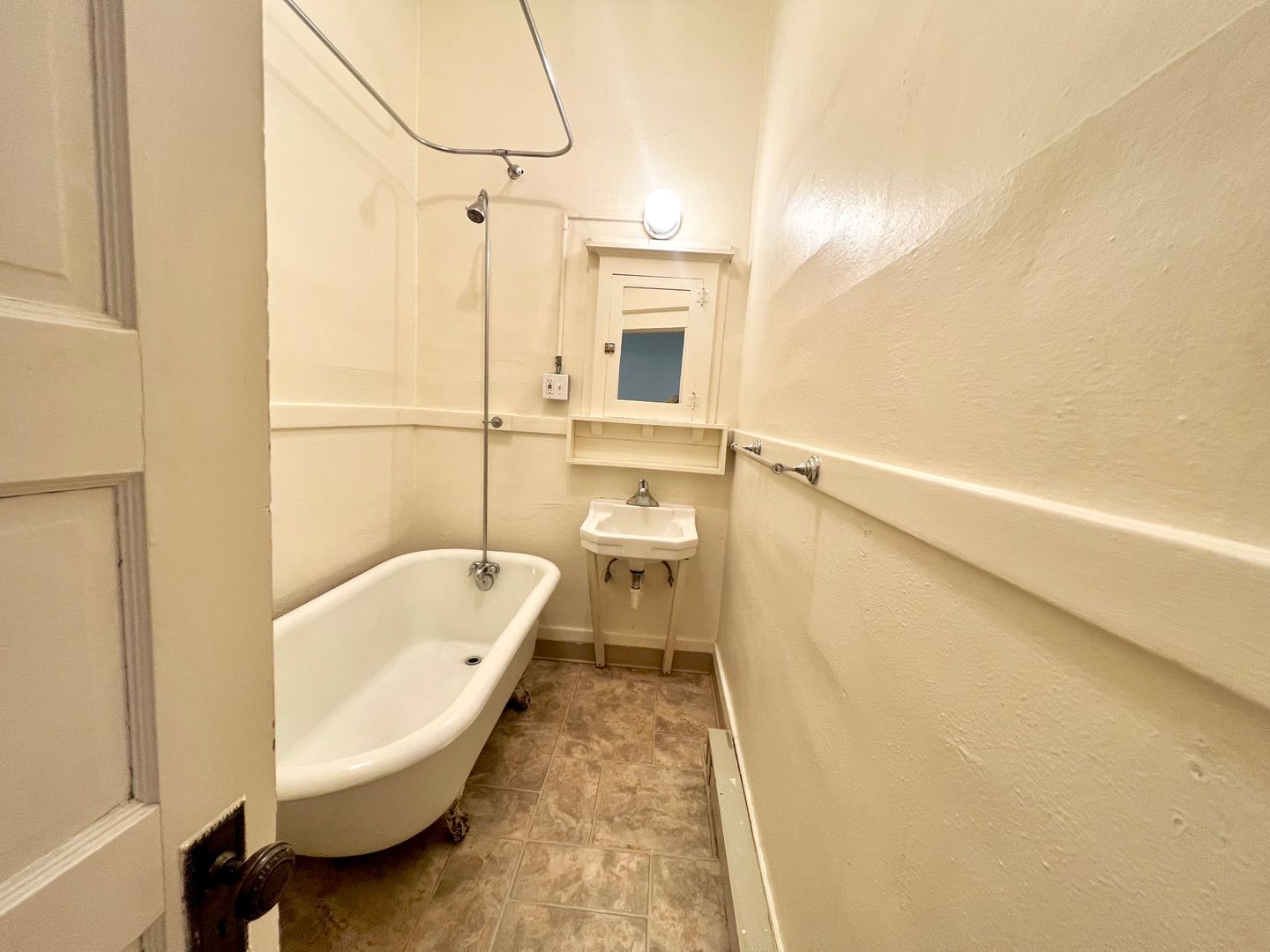 A galley style kitchen provides tall cabinets with plenty of storage. Just off of the living room is a private exit to the shared covered outdoor porch. The Primary Bedroom has a large walk-in closet, and the bathroom features a claw foot tub with a pedestal sink. Welcome to your light-filled oasis!