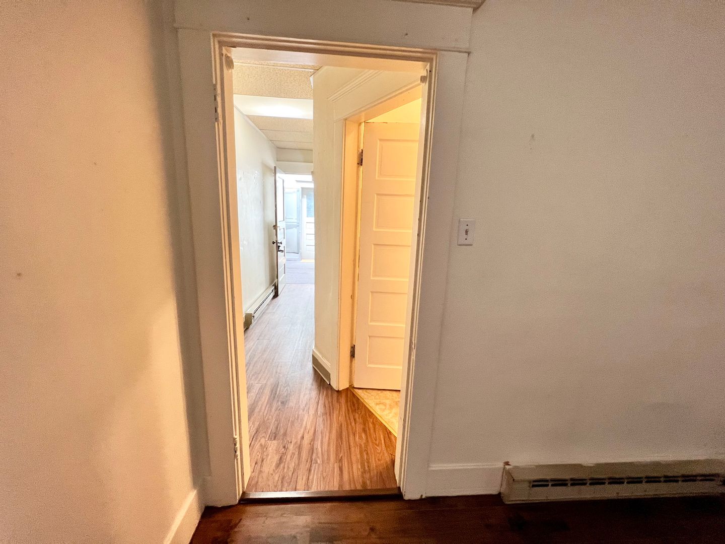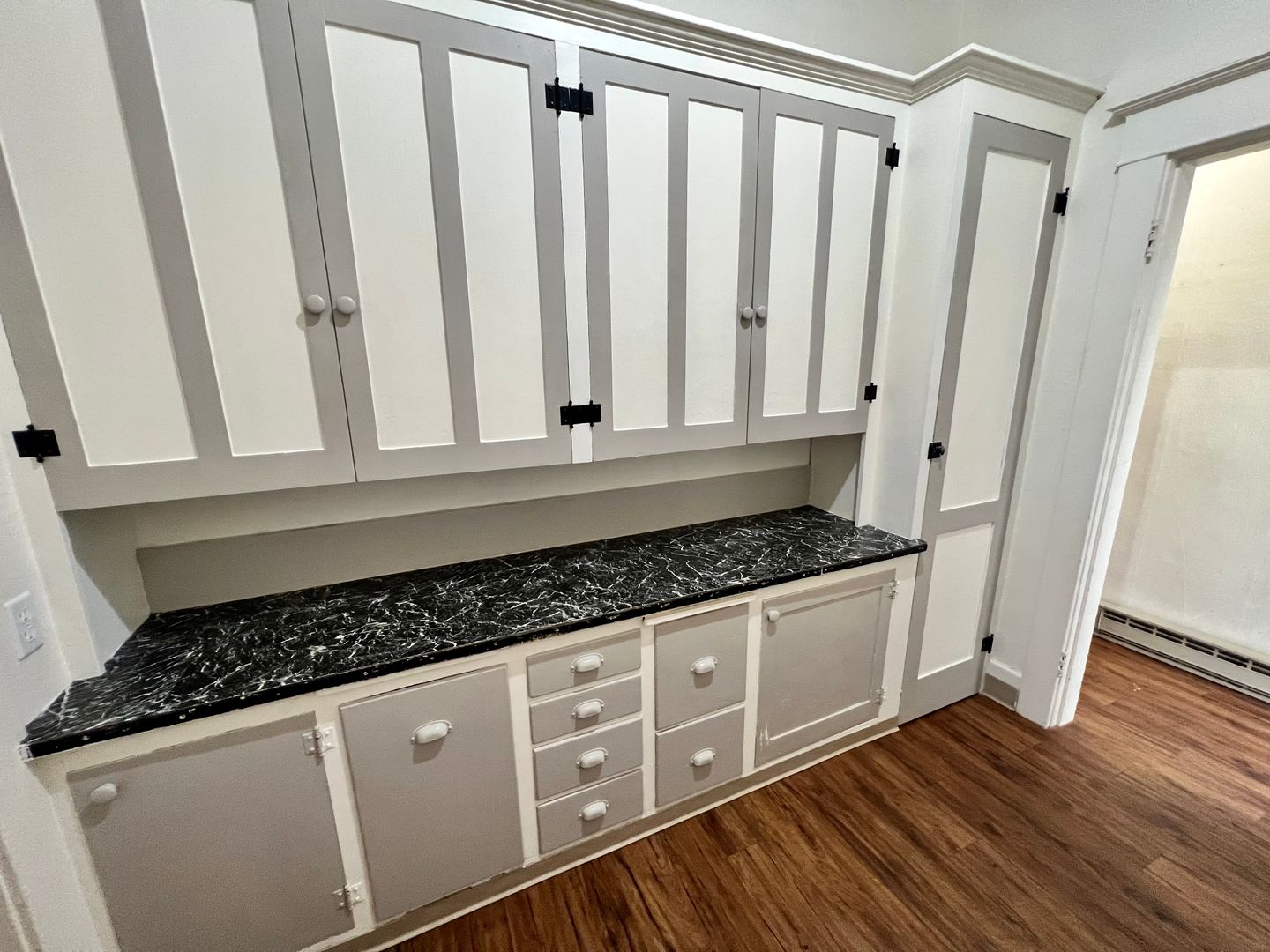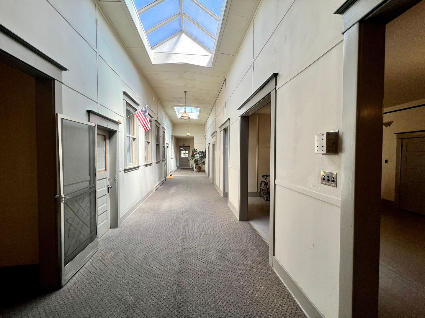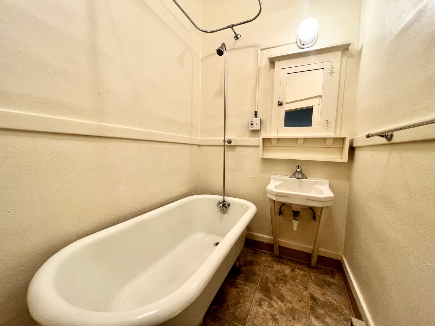A galley style kitchen provides tall cabinets with plenty of storage. Just off of the living room is a private exit to the shared covered outdoor porch. The Primary Bedroom has a large walk-in closet, and the bathroom features a claw foot tub with a pedestal sink. Welcome to your light-filled oasis!